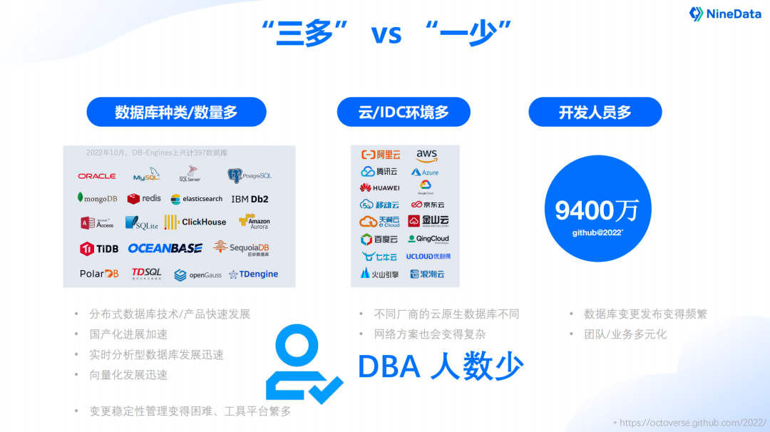 当前数据库领域面临着 “三多” 和 “一少” 的情况。“三多” 指的是数据库种类和数量多,云 IDC 环境多,开发人员多。截至 2022 年 10 月,DB - Engines 上共计 397 种数据库,各种分布式数据库技术和产品快速发展,不同厂商的云原生数据库不同,数据库变更发布变得频繁,国产化进展加速,网络方案也会变得复杂,团队和业务多元化,实时分析型数据库和向量化发展迅速。而 “一少” 则是指 DBA 人数少,这使得变更稳定性管理变得困难,工具平台繁多。
