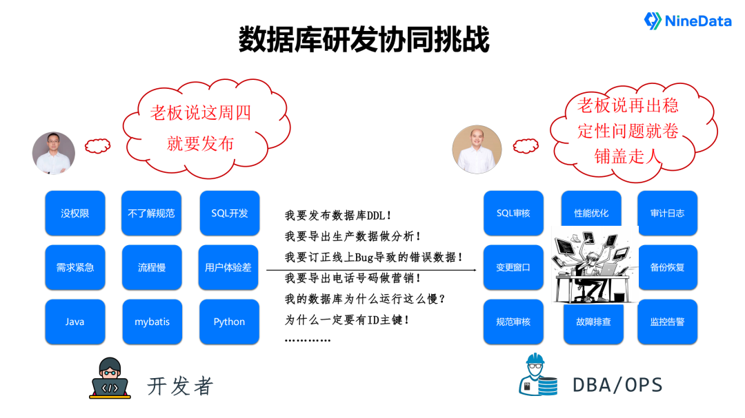 周振兴指出,在数据库研发协同过程中,存在着诸多挑战。企业的技术负责人对发布时间有严格要求,同时对稳定性问题非常关注,一旦出现问题可能会导致严重后果。研发人员可能面临权限不足、不了解规范等问题,SQL 开发、审核、性能优化、审计日志等环节也存在诸多困难。需求紧急但流程慢,用户体验差,变更窗口和规范审核等问题也给研发带来了困扰。此外,故障排查和监控告警也需要高效的解决方案。