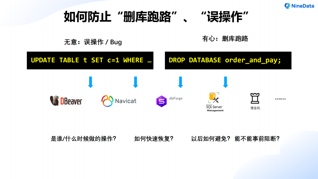 在数据库管理中,我们需要防止 “删库跑路” 和 “误操作” 等情况的发生。例如,无意的误操作或 Bug,以及有心的删库跑路行为,都可能给企业带来严重的损失。我们需要知道是谁、什么时候做的操作,以及如何快速恢复,并且要思考以后如何避免这些情况,能否事前阻断。