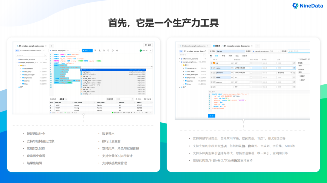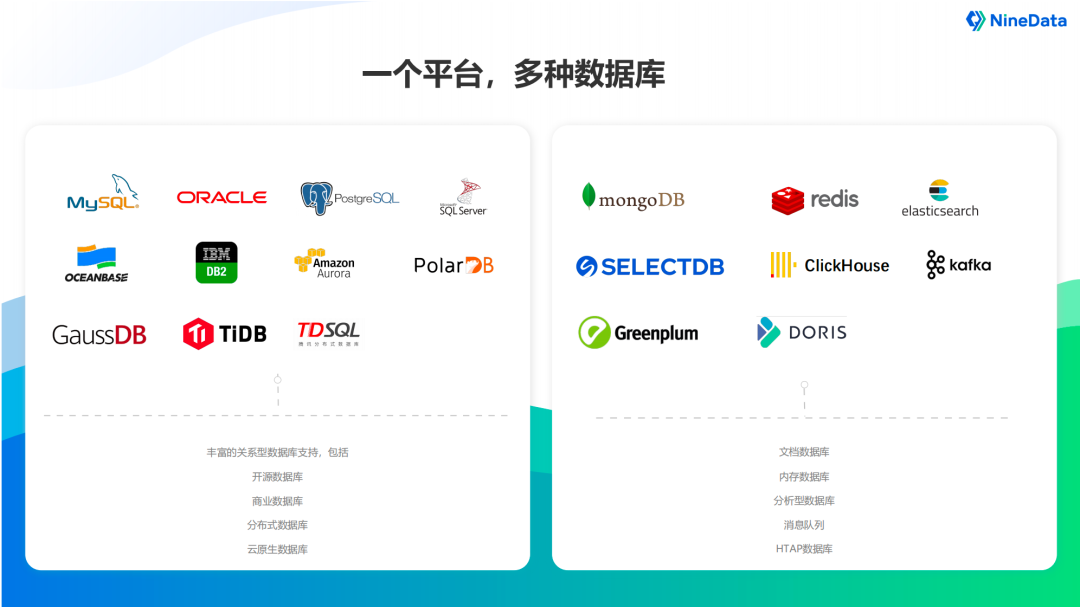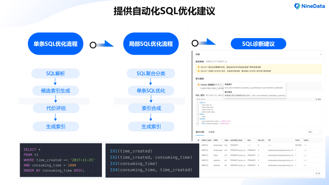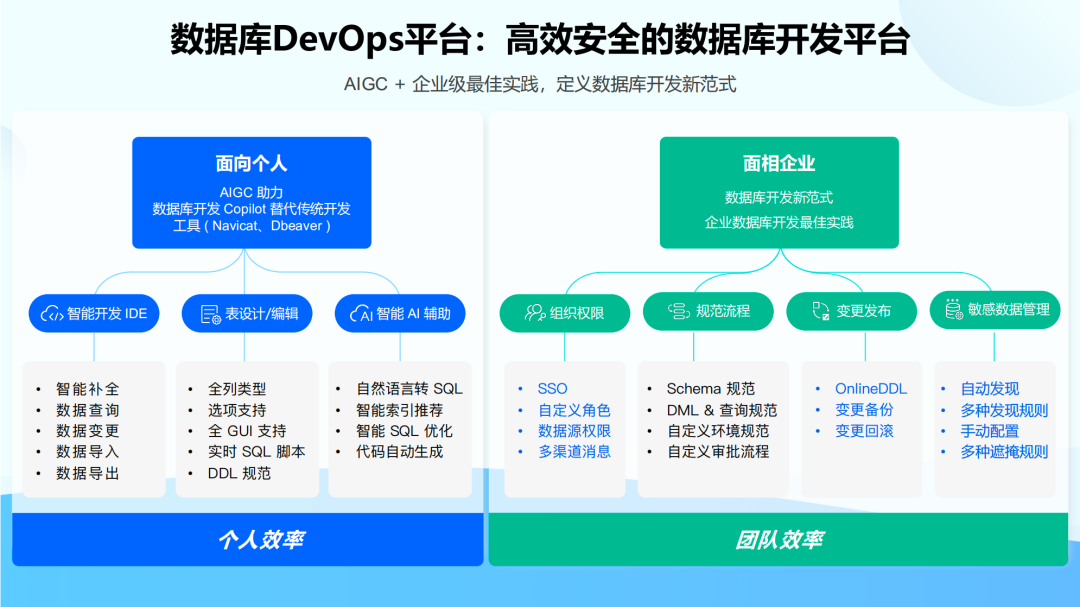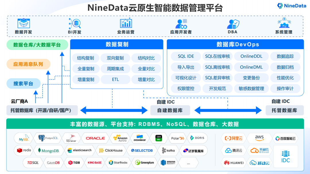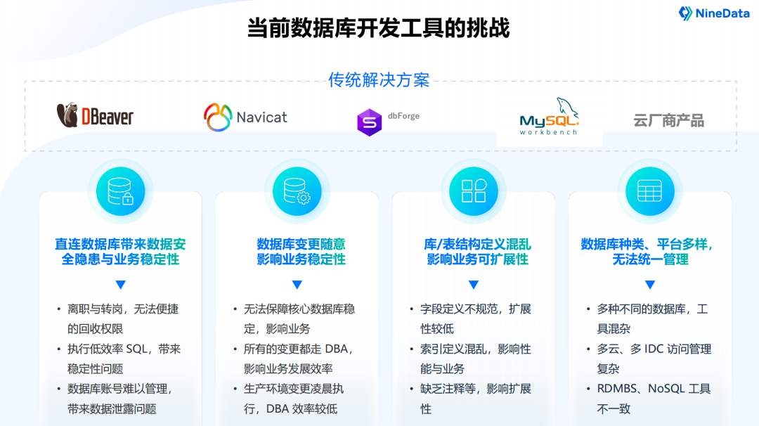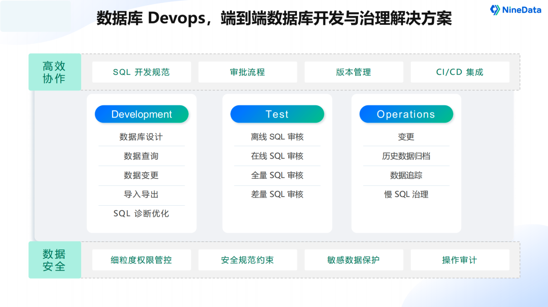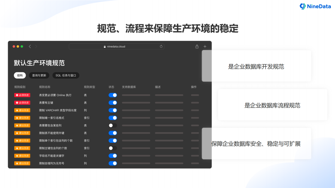NineData 的慢查询分析功能,可实时监控数据库性能状态,定位慢 SQL 和优化数据库,支持单条SQL与局部SQL(某个时间段内的所有SQL),并提供自动化SQL优化建议,包含索引推荐以及SQL语句优化等,提高 SQL 语句的执行效率。面向个人,通过 AIGC 助力数据库开发 Copilot 替代传统开发工具(Navicat、Dbeaver等),提供表设计/编辑、智能开发 IDE、智能 AI 辅助等功能,包括全列类型、智能补全、自然语言转 SQL、智能索引推荐、选项支持、智能 SQL 优化等。面向企业,应定义数据库开发新范式,包括企业数据库开发最佳实践、敏感数据管理、规范流程、变更发布、组织权限等方面。NineData 数据库 DevOps 平台应致力于实现安全、高效的数据库开发。NineData 数据库 DevOps 平台首先是一个生产力工具,具有智能语法补全、支持导航树遍历对象、常用 SQL 保持、查询历史查看、结果集编辑、数据导出、执行计划查看等功能。同时,支持用户、角色与权限管理,全量 SQL 执行审计,敏感数据管理。支持完整字段类型和选项,多种类型索引创建与修改,完整的约束/外键/分区/其他表选项支持。NineData 的数据库 DevOps 平台支持多种数据库,包括 MySQL、Oracle、PostgreSQL、SQLServer、MongoDB、Redis、elasticsearch、Amazon Aurora、DB2、PolarDB、SelectDB、ClickHouse、kafka、Oceanbase、GaussDB、TiDB、TDSQL(腾讯分布式数据库)、Greenplum、Doris等。涵盖丰富的关系型数据库、文档数据库、开源数据库、内存数据库、商业数据库、分析型数据库、分布式数据库、消息队列和云原生数据库等。为了保障生产环境的稳定,需要通过 NineData 制定规范和流程。例如,默认生产环境规范包括表变更必须要 Online 执行、表要有主键、限制 VARCHAR 类型字段长度、限制唯一索引名格式、表需要包含某些列、限制表不能使用外键、限制单个索引包含列的个数、限制主键包含列的个数、字段名不能是关键字、限制自增列为无符号等。这些规范和流程有助于保障企业数据库的安全、稳定与可扩展。NineData 作为新一代的云原生智能数据管理平台,提供了数据复制、数据库 DevOps、数据备份以及数据对比等多种功能,帮助用户轻松实现混合云、多云数据源的统一管理。通过这些功能,可以轻松完成日常数据库开发、数据安全访问、生产数据库变更与发布、数据库备份恢复、数据迁移、容灾多活、数据仓库及数据湖构建等核心应用场景。展望未来,数据库 DevOps 的技术领域充满希望,NineData 将与所有用户、合作伙伴和数据库从业者不断探索和创新,为企业提供更加高效、安全和可靠的数据库解决方案。相信在未来的发展中,NineData 将为企业的数字化转型提供更强大的支持,助力企业实现更高的业务价值和竞争力。