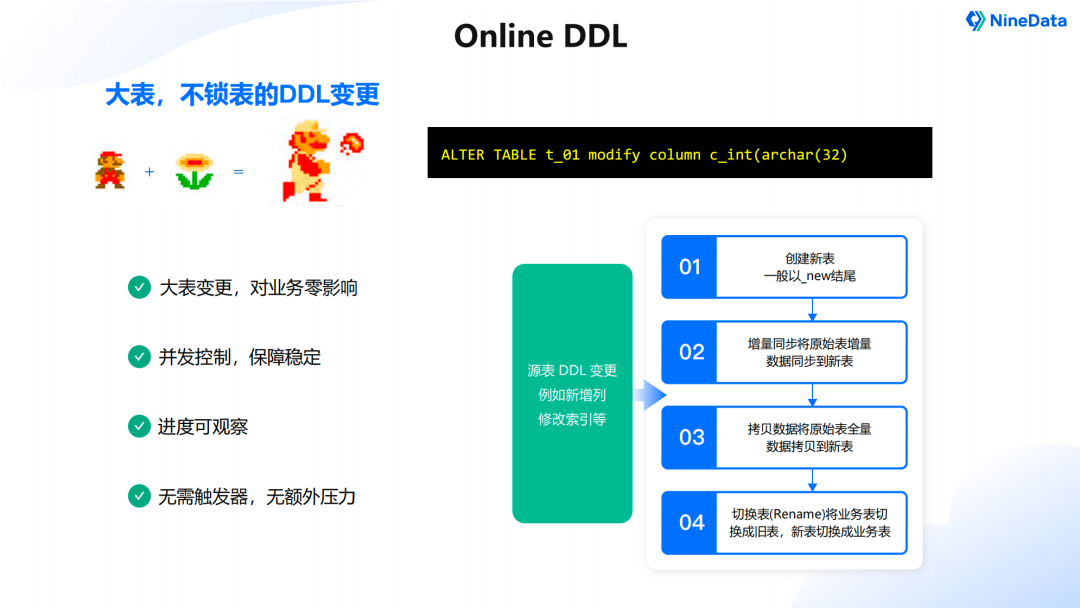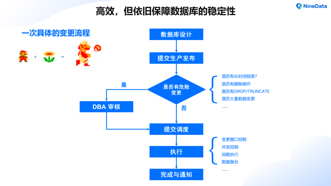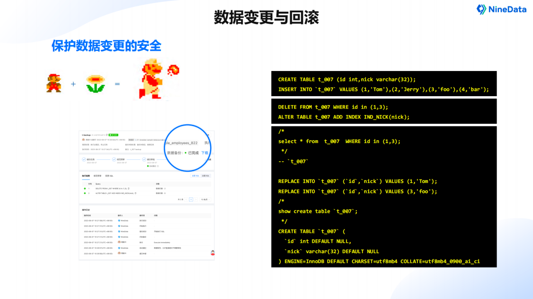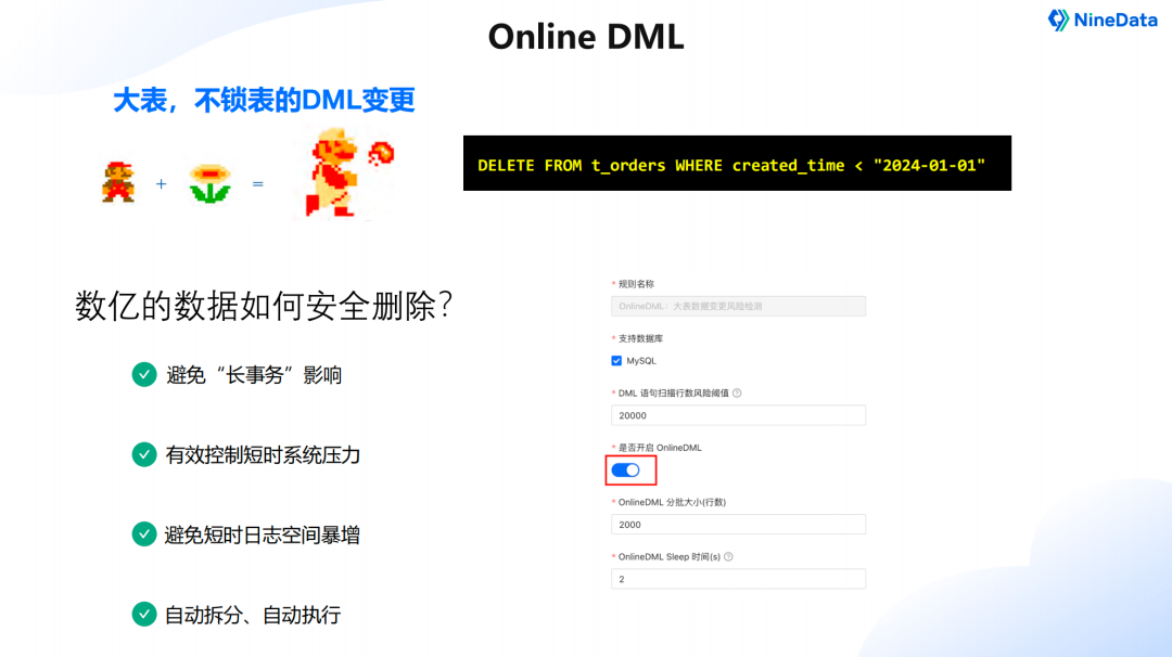 为了解决这些问题,玖章算术研发了 NineData 数据库 DevOps 平台,提供端到端的数据库开发与治理解决方案。NineData 平台包括了高效协作、数据安全等方面,实现 SQL 开发规范、审批流程、版本管理、CI/CD 集成等功能,同时进行细粒度权限管控、安全规范约束、敏感数据保护和操作审计。高效协作是 NineData 数据库 DevOps 平台的重要目标之一。在 SQL 开发规范方面,我们应制定相关标准。在结构规范上,支持字符集默认 utf8mb4,默认自增主键,默认字段定义为 not null,INT 默认带 unsigned;在索引合理上,支持索引命名规范,不过多使用单列索引,字符尽量定义前缀;在SQL高效上,支持尽量使用索引和覆盖索引,避免 WHERE 中的隐式转换等。这样可以提高开发效率,同时保障数据库的稳定性。在进行一次具体的变更时,我们需要考虑多个因素。首先要判断是否有长时间锁表、删除操作、DROP/TRUNCATE 操作以及大量数据变更等情况。如果存在这些情况,需要提交给DBA审核后再提交到调度。在执行中,进行变更窗口控制、并发控制、间歇执行和数据备份等操作,以确保数据变更的安全和稳定。在进行数据变更时,我们需要保护数据的安全。例如,对于数据备份,要确保备份已完成。在进行数据变更操作时,如 INSERT、DELETE、ALTER TABLE 等,要注意操作的准确性和安全性。同时,要对数据变更进行记录和跟踪,以便在出现问题时能够快速恢复。对于大表的 DML 变更,我们需要注意安全删除大量数据的问题。例如,对于数亿的数据,如何安全删除是一个挑战。我们可以采用一些策略,如“开启OnlineDML”,可以避免 “长事务” 影响,有效控制短时系统压力,避免短时日志空间暴增等。