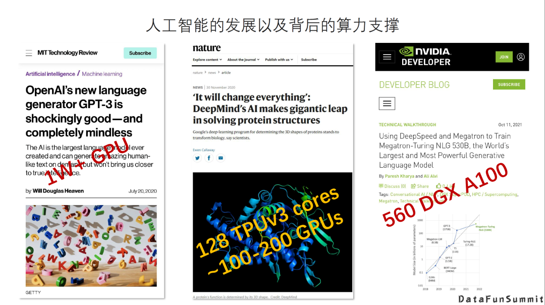 我们看到近几年取得非常惊人效果的AI模型,比如GPT-3、AlphaFold等,其实背后都用了大量的的GPU芯片来作为训练的平台。像最右侧英伟达和微软合作训练的530B参数的模型使用了560个DGX A100平台。这些芯片提供的算力为人工智能的发展提供了巨大的支撑。