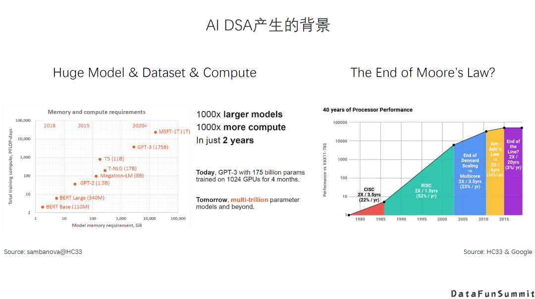 总之,不管是对巨型模型的支持,还是碎片化的需求,都和通用处理器提供的处理能力之间有很大的GAP,所以近几年我们针对AI提出很多专用的架构(DSA)。