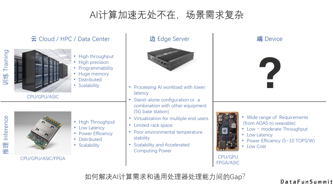 第二,AI计算现在无处不在,AI计算任务多样且复杂。例如,在云上、边缘侧与端设备上,不同的场景下面包括不同的训练和推理的需求,差异是非常大的。在云上进行训练,可能需要非常高的吞吐量,非常高的精度,以及非常强的扩展性等等;而在端上,情况更加复杂,会有计算量需求巨大的情况,如自动驾驶可能需要P级算力;同时,也会有能耗和成本非常受限的应用,像可穿戴设备中的AI计算等等。