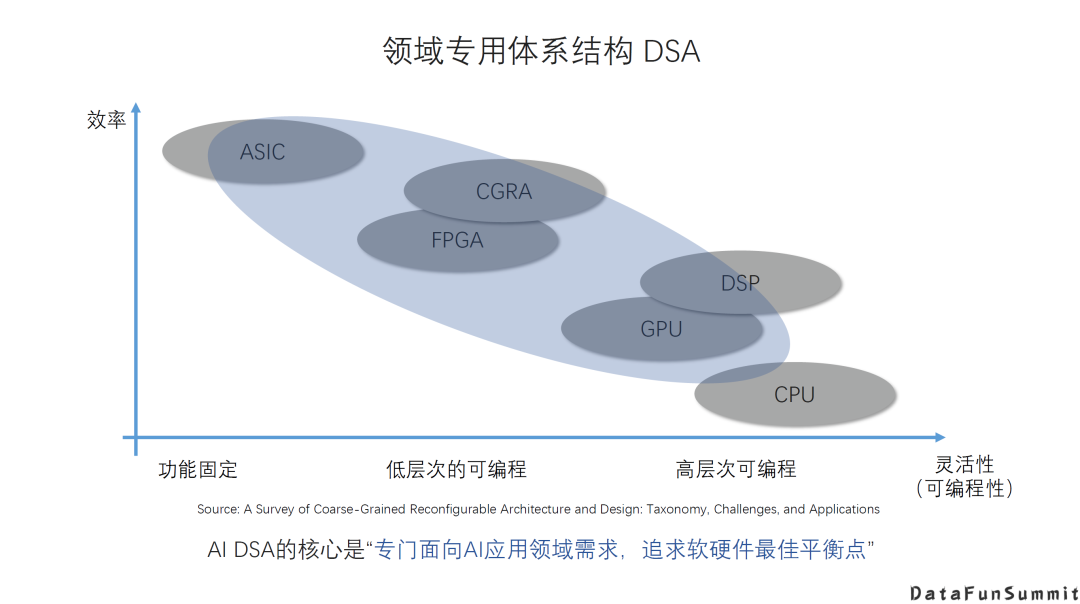 近几年,“领域专用架构DSA”被不断提起,它其实也不是一个新的概念。我们看图中这些最常见的芯片架构,除了CPU是一个通用架构之外,实际上其它的都可以认为是一个领域专用的架构,也就是为了效率和灵活性上找一个最优点而针对某一个领域或者某一类应用而设计的架构。