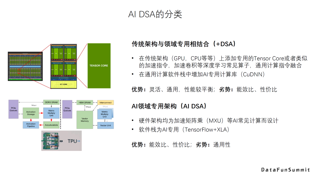 传统架构+DSA。在传统架构的基础上增加新的DSA的硬件以及相应的指令。例如GPU增加Tensor Core这种专用的加速器。它的优势是灵活通用,性能比较平衡,而劣势是相对更专用的DSA在特定应用场景下的能效比、性价比。