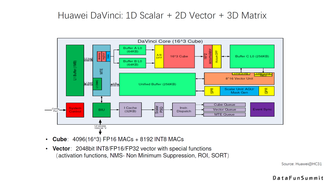 华为的DaVinci架构:这是一个比较典型的Al DSA架构,它从一维的Scalar到二维的vector再到三维Matrix,都有专用硬件加速引擎,同时也有相应的Memory的Hierarchy,包括各种Buffer,也是AI的专用加速器常见的一种设计选择。