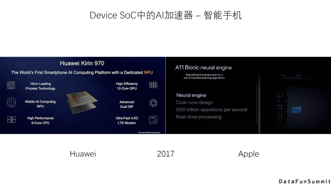 Device Soc也加入了Al DSA的设计:2017年的时候华为旗舰智能手机芯片开始加入了NPU,苹果也加入了Neural Engine,到现在都发展了好几代,而且AI加速在芯片的SOC里面占的分量也是越来越重。