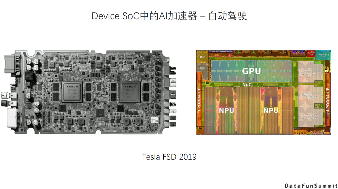 还有一个很典型的Al DSA场景就是自动驾驶芯片:这个是2019年特斯拉发布的FSD,可以看到在它的芯片里面,NPU这一部分也是占了相当大的面积。