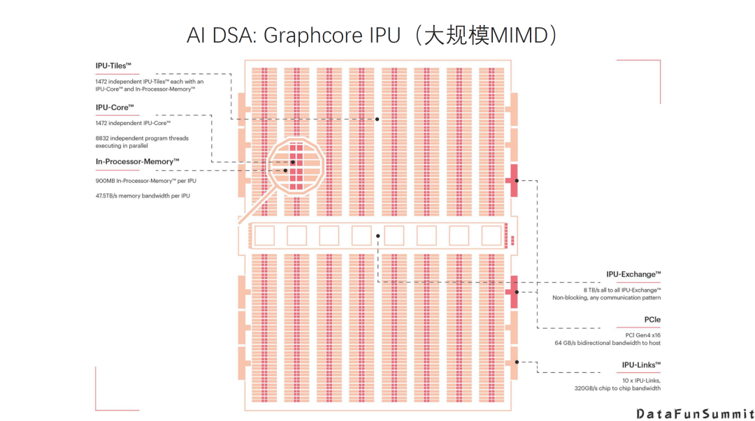 例如Graphcore IPU,它是一个非常大规模的规模的的MIMD多核系统。它在设计里面另一个比较大的创新就是实现了非常大的片上SRAM。另外它的多核互联,多核同步机制也有很多有意思的设计。