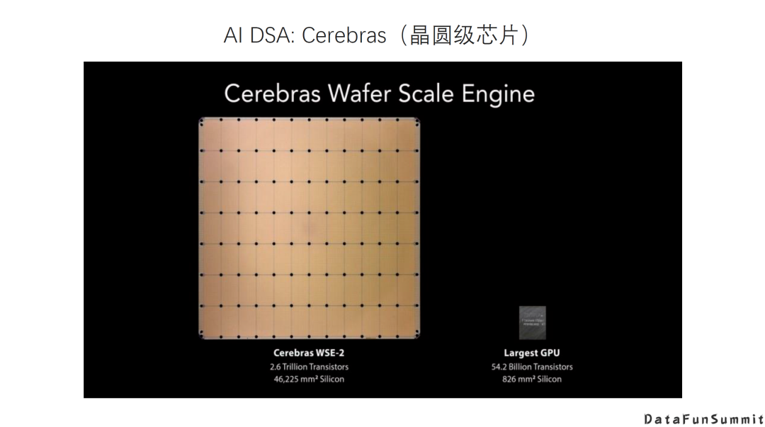 另外一个是Cerebras晶圆级芯片,一个芯片就是用整个晶圆来实现的,比普通的芯片面积要大得多,可以在一个芯片内实现更大规模的算力。当然相应的也会有很多挑战在里面,硬件的挑战,系统的挑战。Cerebras的WSE是算力提升的一个思路,也做了大量工程上的创新,非常值得关注。