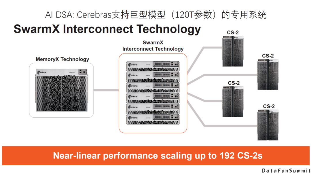 此外,Cerebras除了大规模的芯片和相应的CS-2的硬件系统之外,还提供了专用的互联和存储设备,目标是支持一个120T参数级别的神经网络的模型。其实我们现在看到的参数级别已经有上T的了,可能未来这种100T参数级别的模型也会出现。像这一类AI DSA,未来发展的方向可能是针对一个更专用的领域去优化,比如支持巨型模型。