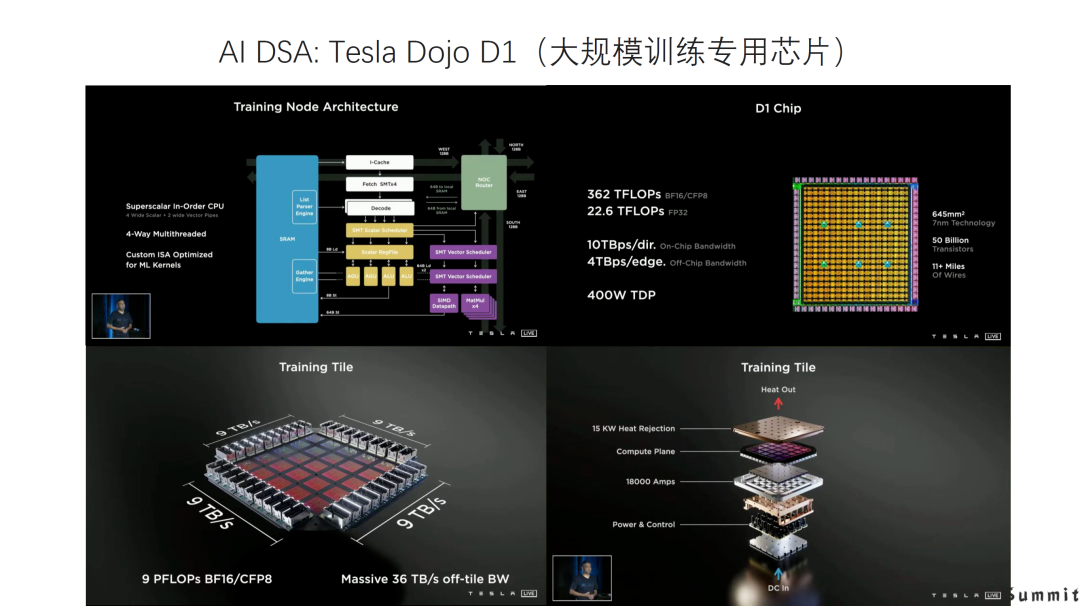 再说一个很有意思的架构,就是特斯拉发布的Dojo D1。从基本的设计思路,然后到系统级的封装,都做了很多创新的工作。它的出发点是想设计一个专门针对神经网络训练的DSA,也很值得大家的关注。