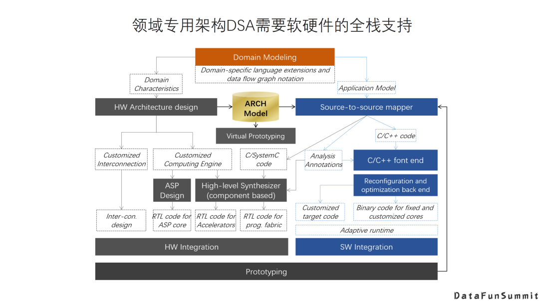 面向一个领域的DSA往往是设计一个新的架构,而一个新的架构并不是单纯的硬件设计,而是需要的软硬件的全栈支持。一个新的硬件架构,它可能有需要有新的指令集或者编程模型,需要有相应的软件工具,甚至可能需要有一个软硬件协同设计和验证的方法学。这些必须是一个完整的解决方案,才能让一个新的DSA能够得到比较好的应用。