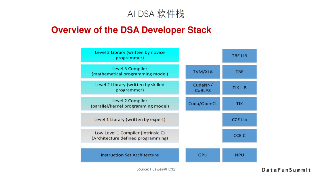 这也是华为在Hotchip上分享达芬奇设计的时候,介绍的DSA开发者软件栈。可以看到在这个软件栈里面,会有不同的层次的开发者参与,也需要提供不同层次的完整的软件工具,包括库,编程语言,编译器等等。