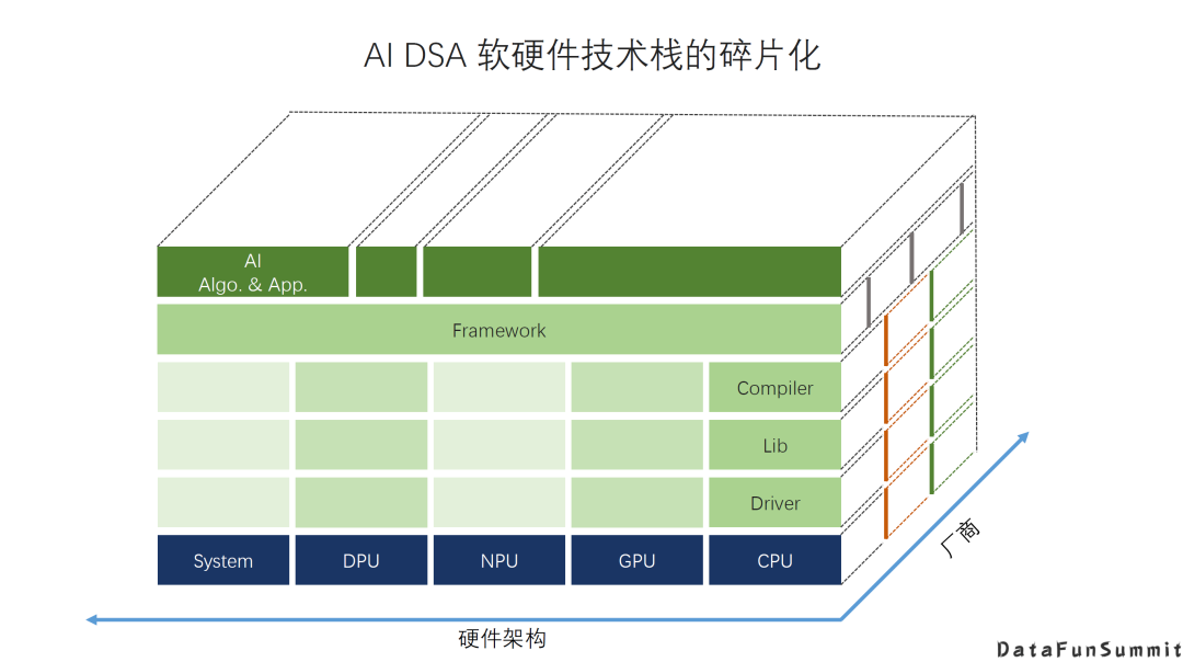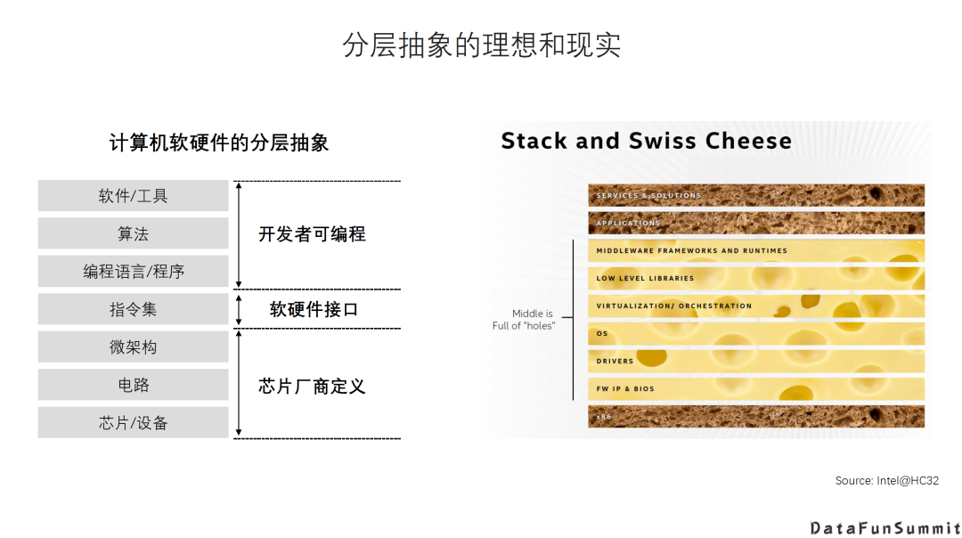 这里看到的“奶酪”情况还是针对比较成熟的CPU生态。而由于AI DSA来说,至少到目前为止,还没有大家公认的分层模型和接口的设计。为了追求硬件性能,或者是充分利用现在DSA硬件的创新,不得不让程序员或者软件工具直接面对很多硬件的复杂度,导致整个软件栈设计面临更大困难。