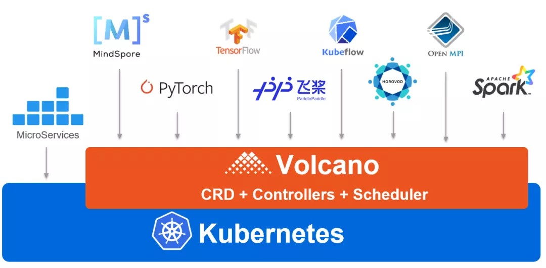 业界在使用一些计算框架进行大规模运算时,由于不同框架对作业管理、并行计算等要求不同,导致在高计算密度情况下,资源需求波动大,缺乏高级调度能力。同时也导致了后续部署运维复杂等问题。Volcano 面向主流计算框架提供统一的批量调度平台,提高资源利用率。同时还提供通用的作业管理、Fair-share,Gang ,bin-pack,preempt,reservation等高级调度算法,简化运维管理。目前 Volcano 已经支持几乎所有的主流计算框架,包括 MindSpore、TensorFlow、Kubeflow、MPI、PyTorch、飞桨、Spark、Flink、HOROVOD 等。