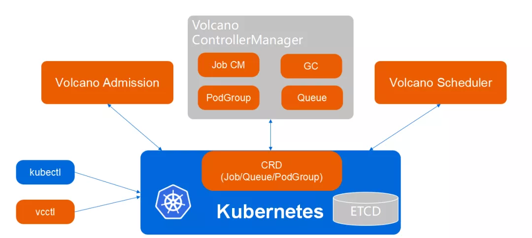 Volcano 核心组件主要包含三个:Admission、ControllerManager、Scheduler 。- Admission 对 Volcano CRD API 提供校验能力;