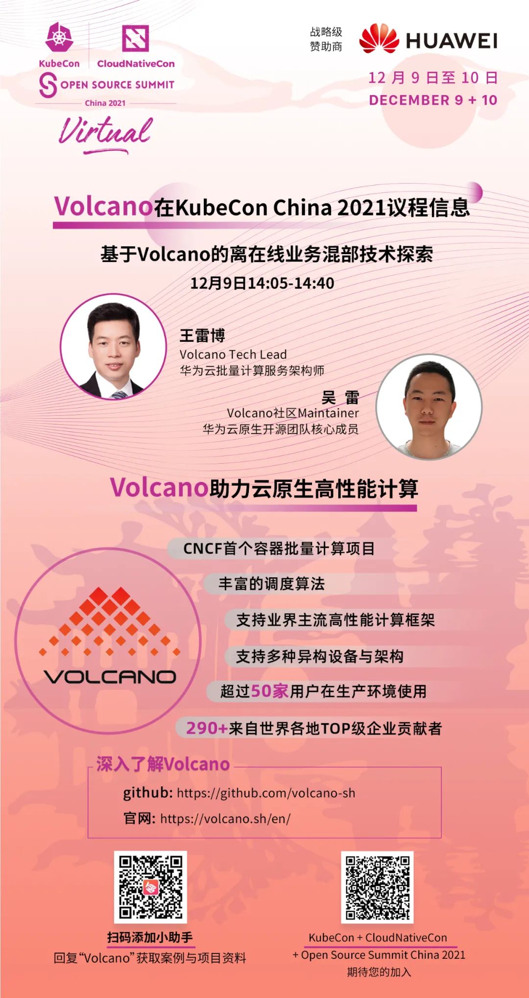 若想了解更多Volcano 项目的技术原理与实践干货,敬请关注 12 月9 日 - 10 日举办的 KubeCon +CloudNativeCon + Open Source Summit China 2021。届时将有来自华为云的资深云原生技术专家,为广大开发者带来精彩的 Volcano 技术分享:
