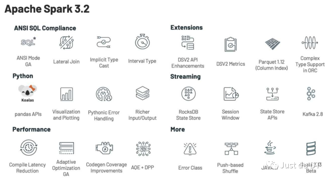 在 PySpark 上支持 Pandas API 层 (SPARK-34849) 默认启用自适应查询执行(AQE)(SPARK-33679) 支持push-based shuffle,提高shuffle效率 (SPARK-30602) 添加 RocksDB StateStore 实现 (SPARK-34198) 基于 EventTime 的会话化(会话窗口) (SPARK-10816) ANSI SQL 模式 GA (SPARK-35030) 支持 ANSI SQL INTERVAL 类型 (SPARK-27790) 查询编译延迟减少 (SPARK-35042, SPARK-35103, SPARK-34989) 支持 Scala 2.13 (SPARK-34218)