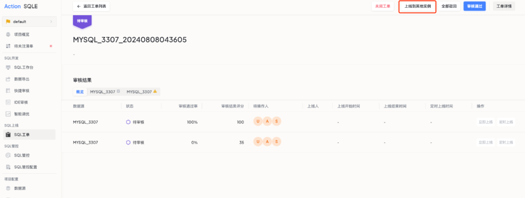 1. 进入工单详情,点击“上线到其他实例”按钮。