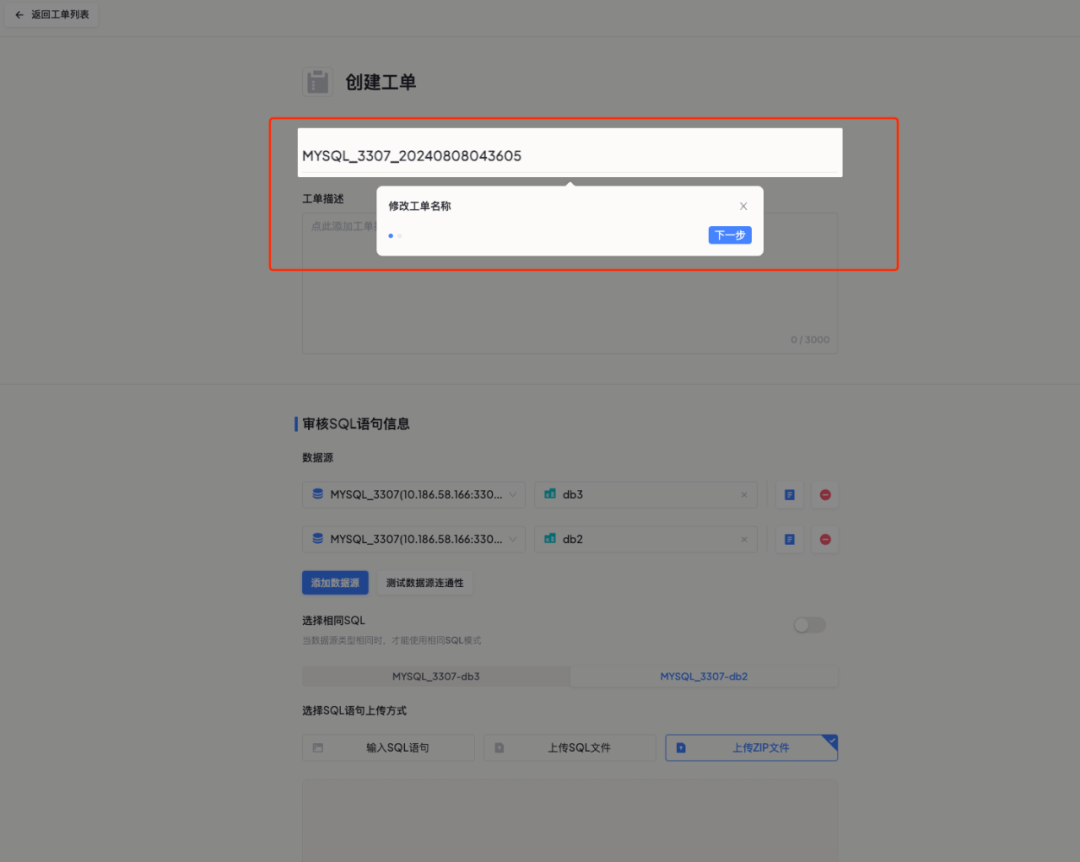 2. 根据提示变更工单名称及需要上线的数据源,同时确认需要上线的 SQL/SQL 脚本配置是否符合预期。