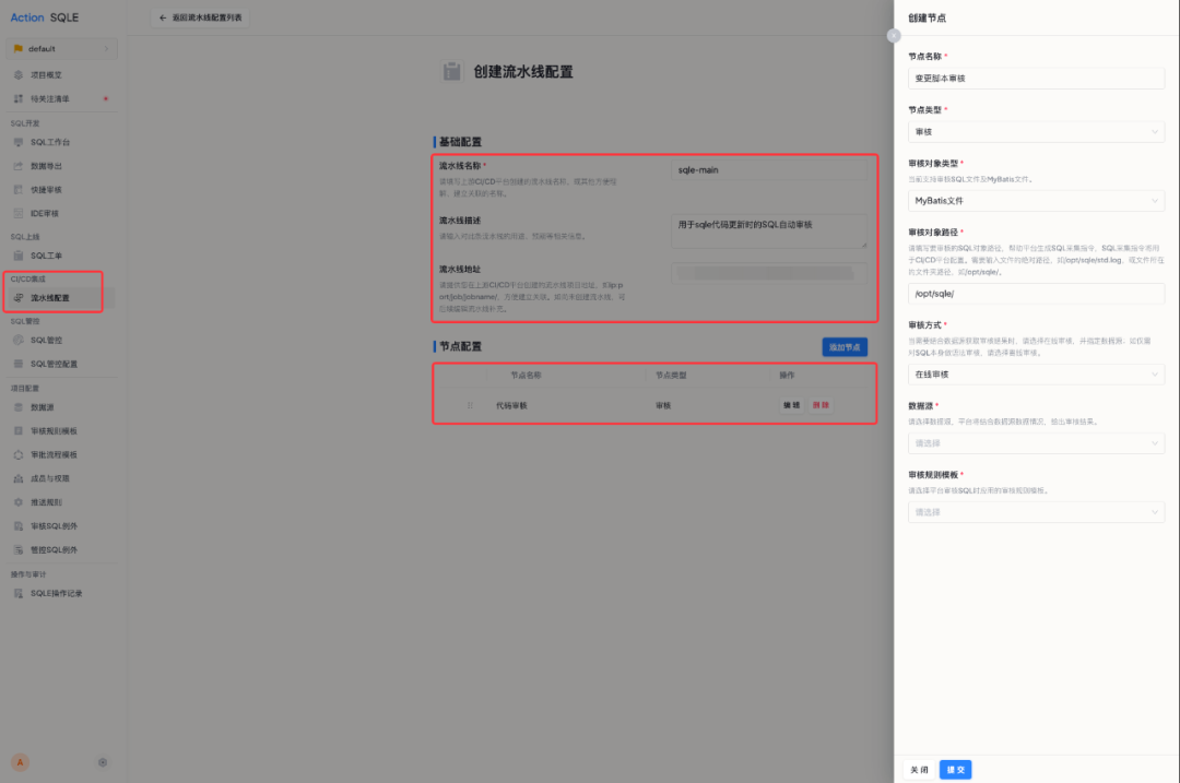 在代码提交和版本迭代的关键节点,为确保代码在合并至主分支或部署至生产环境前,SQL 代码的质量得到严格把控,防止不良 SQL 影响生产,您可以将 SQLE 的审核功能嵌入到您的流水线中。这一集成操作在代码提交时自动启动 SQL 质量检测,不仅确保了代码库中 SQL 语句的高标准和性能,同时也简化了集成过程,减少了对接成本。
