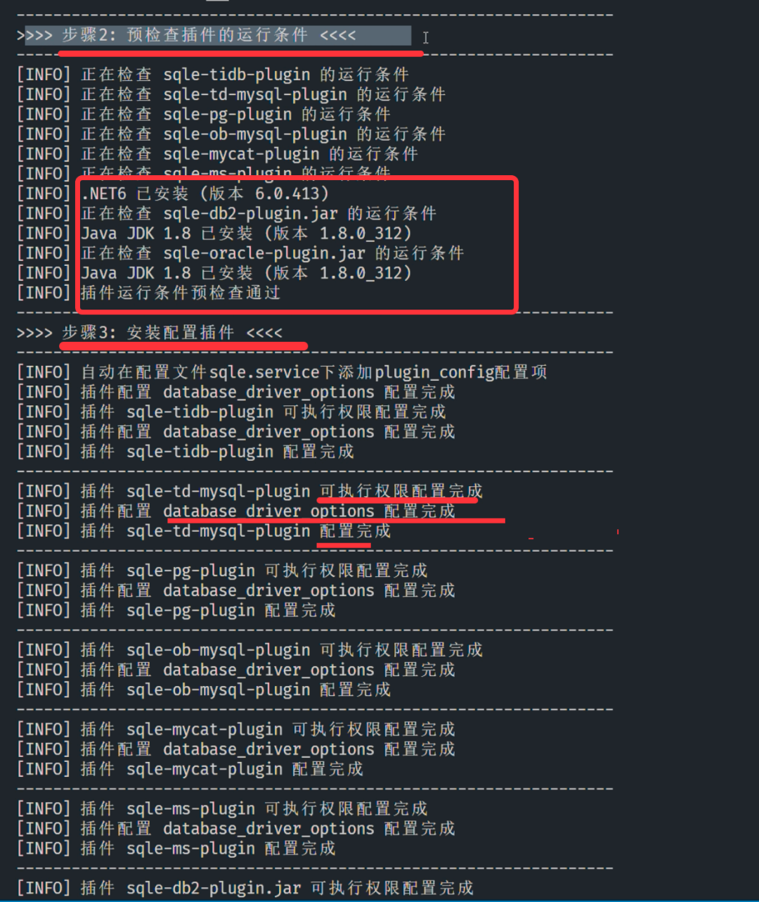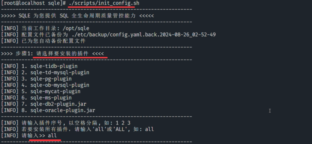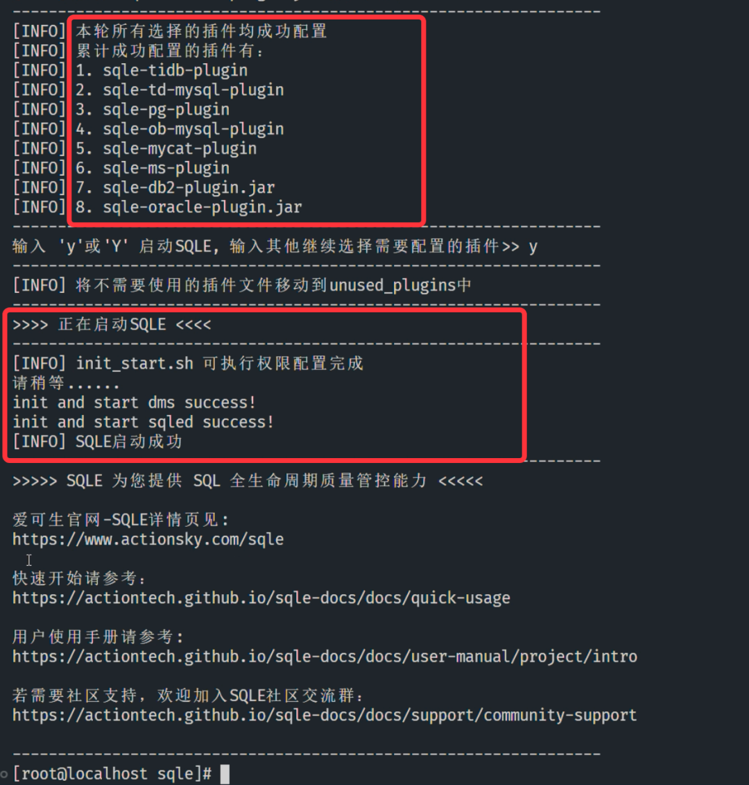 接下来,脚本将结合选定的插件类型,自动校验当前环境信息,通过后自动修改插件执行权限、config.yaml 文件等,并在配置完成后自动启动 SQLE。