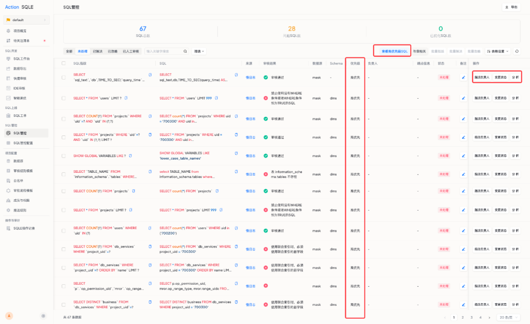 2. 在 SQL 管控中,您可以查看已采集的慢 SQL,高优先级标准的 SQL 会被标注,便于您集中处理这些关键 SQL。
