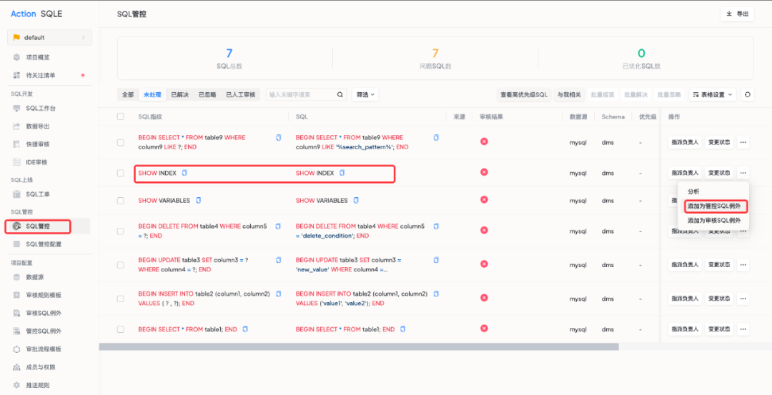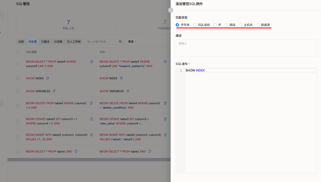 当在 SQL 管控面板中遇到 SHOW INDEX 这类语句时,可以将其添加为管控 SQL 例外。