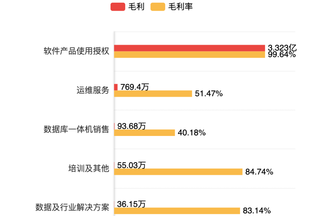 同时可以看到达梦的营收主要是软件授权,占比高达94%+,同时毛利也是非常高,高达99%。