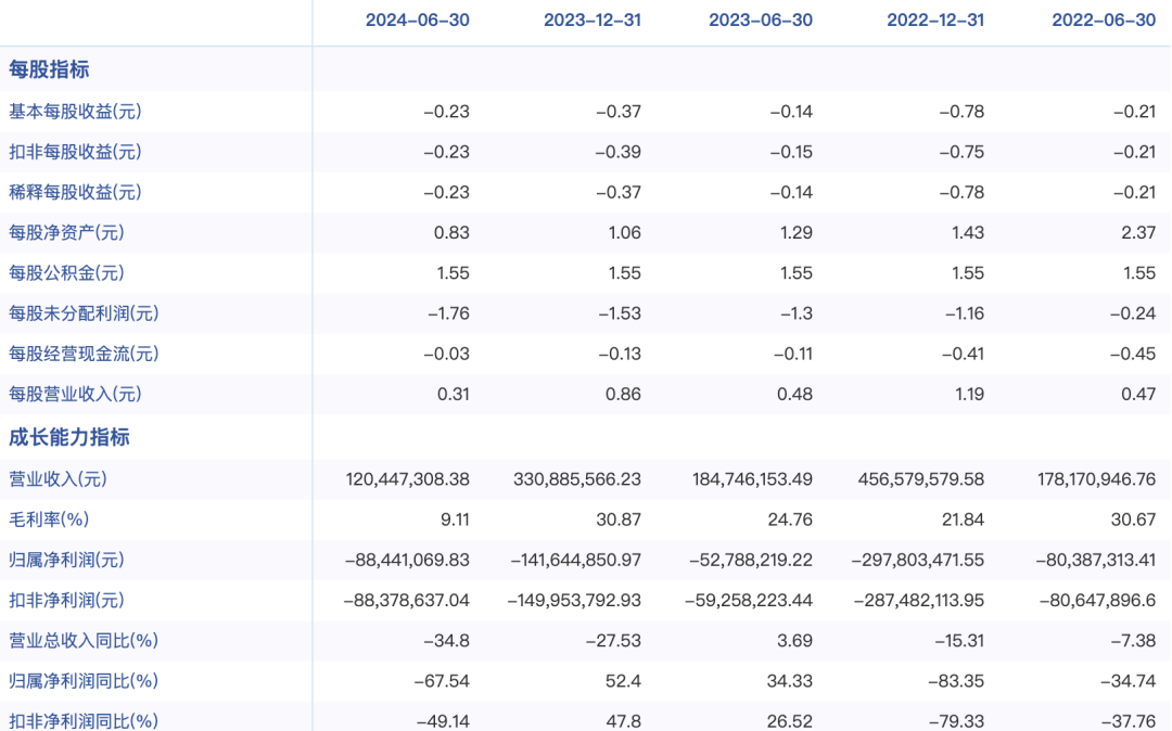 可以看到2024年半年报,营收仅有1.2亿,而2023年半年报营收是1.8亿左右,大概跌了1/3,这还是蛮惨的。