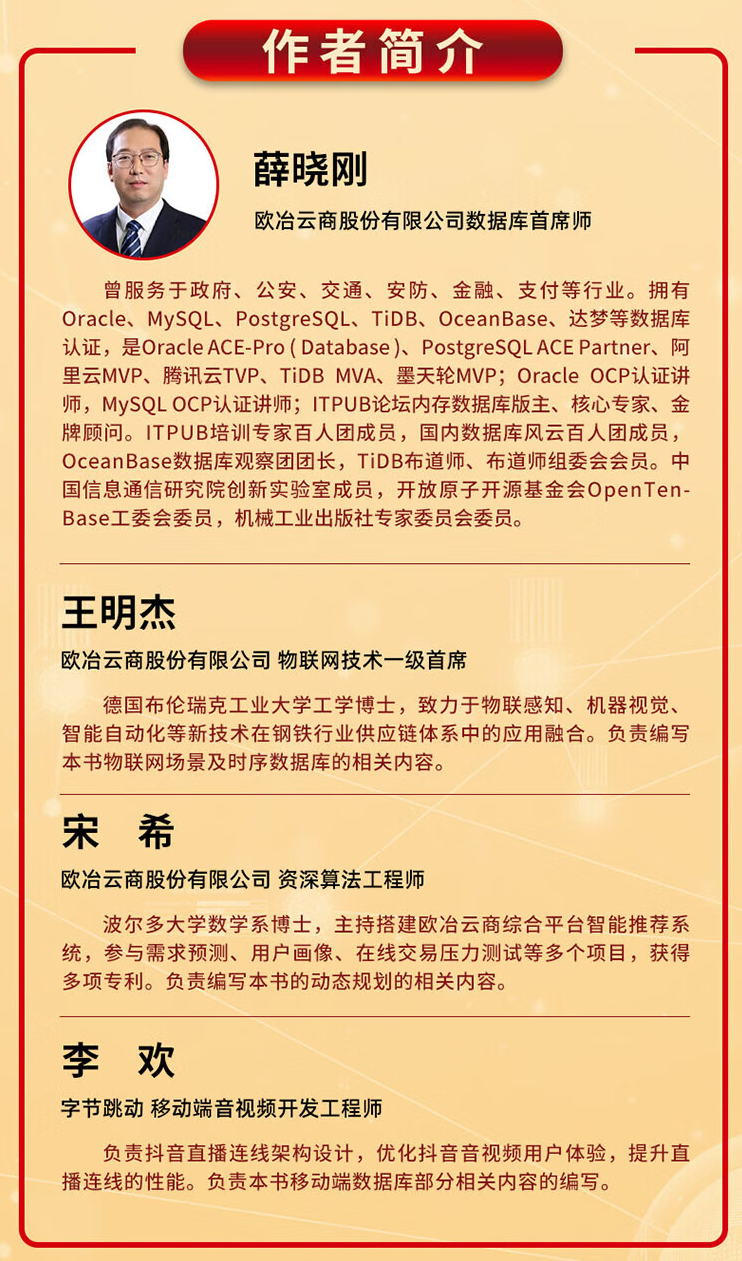 作为一个阅读了市面上几乎所有MySQL书籍的读者,我通常只能从每本书中收获大约5%的新知识。前段时间,我读了一本与PG相关的书籍,跨领域让我学到了很多新知识。不同技术栈的书籍往往能带来更多的收获和快乐。而薛老师这本书涵盖了三大关系型数据库,相信大家在阅读过程中也会收获满满的知识与乐趣。