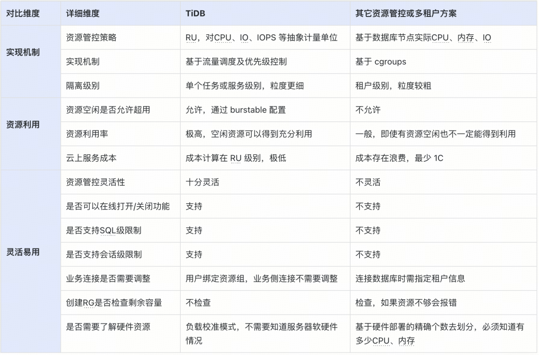 ● 资源管控:TiDB 通过流控和优先级调度实现资源管控,确保应用资源隔离和服务质量。数据库资源池划分为多个资源单元(RU),以统一计量 CPU、IO 等资源消耗,与其他多租户方案相比,TiDB 资源管控更细致且灵活。