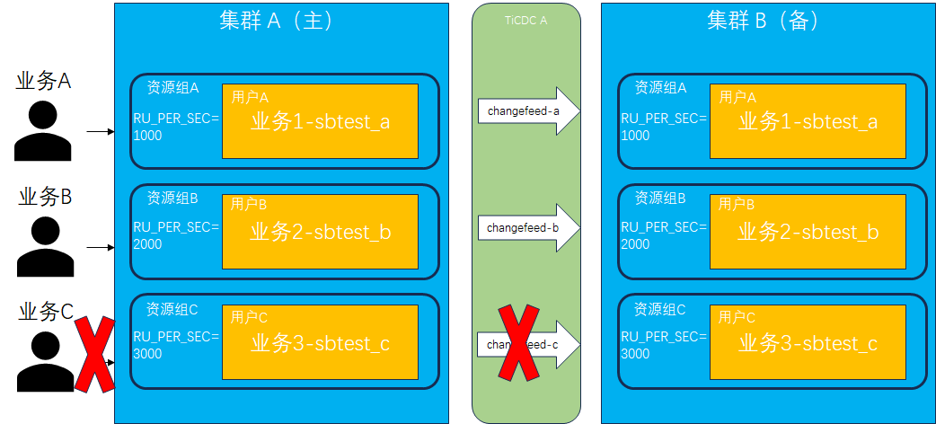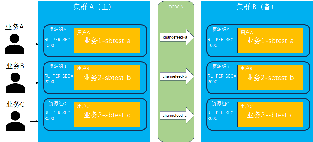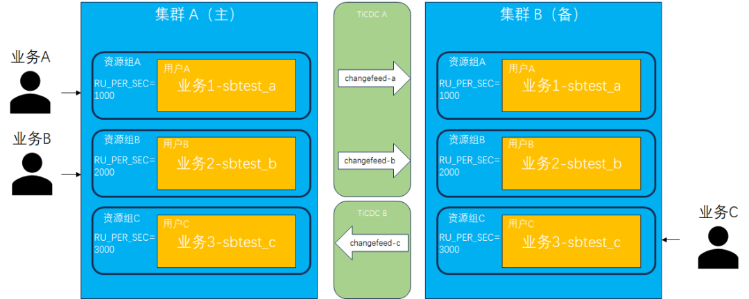 创建用户并绑定资源组:分别在两套集群中创建 3 个用户 (userA、userB、userC) 及 3 个资源组 (rgA、rgB、rgC),用户和资源组一一绑定。分别使用不同用户在数据库中创建各自的 database,分别为 sbtest_a、sbtest_b、sbtest_c,它们代表不同业务系统的后台数据库。