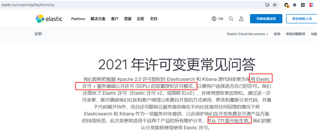 然而,在 2021 年,Elasticsearch 将其核心产品从 Apache 2.0 协议更改为 Server Side Public License (SSPL) 和 Elastic License (ELv2) 双重许可,引发了广泛的讨论和争议。