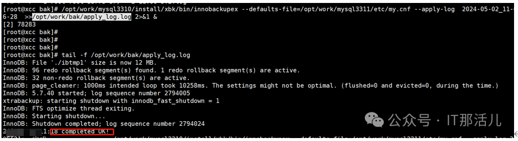 /opt/work/mysql3310/install/xbk/bin/innobackupex --defaults-file=/opt/work/mysql3311/etc/my.cnf --apply-log 2024-05-02_11-06-28 >>/opt/work/bak/apply_log.log 2>&1 &