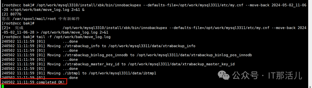 /opt/work/mysql3310/install/xbk/bin/innobackupex --defaults-file=/opt/work/mysql3311/etc/my.cnf --move-back 2024-05-02_11-06-28 >/opt/work/bak/move_log.log 2>&1 &