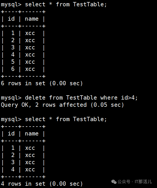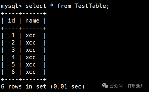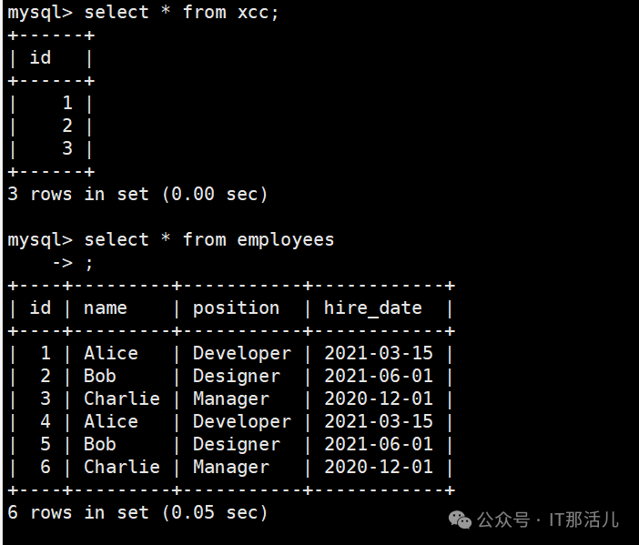 此时可以看见通过binlog可以将数据进行恢复,读取binlog时跳过了删除的gtid,并且也成功恢复了删除后写入的另外的表xcc数据,最后将相应数据和研发核对,没有问题后,将数据导出来后,业务在自行进行导入。