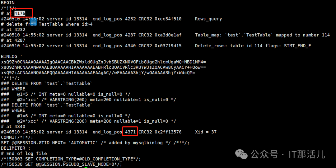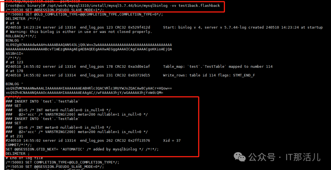 [root@xcc binary]# ./flashback --databaseNames=test --tableNames=TestTable --start-position='4176' --stop-position='4371' --