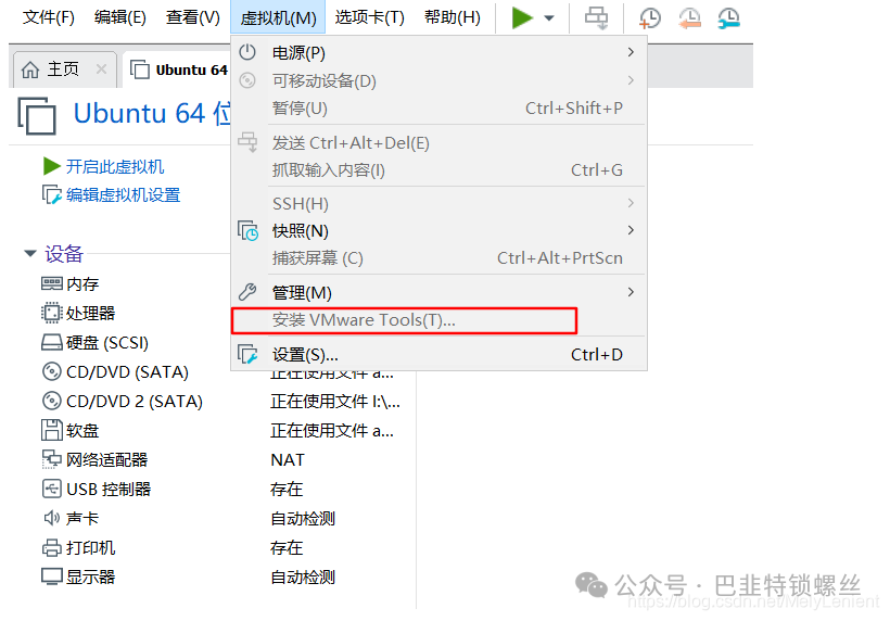 VMware Workstation 中“安装VMware Tools”是灰色的,无法点击安装,网上那些点击安装的办法也就都不能用了。截图如下: