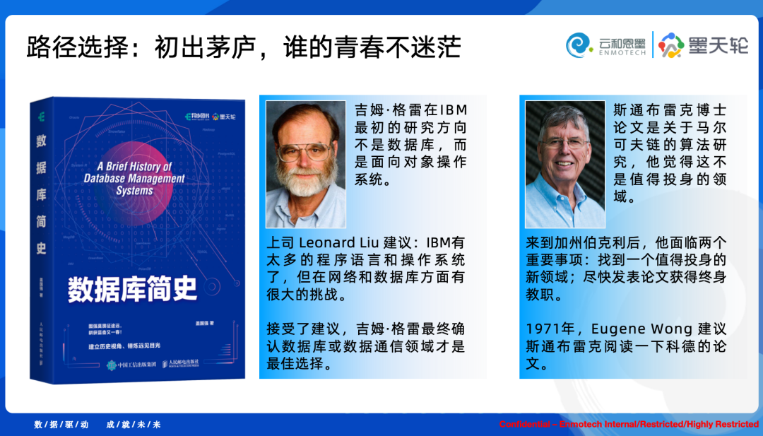 在《数据库简史》一书中,我遴选了几位大神的职业生涯选择的故事,作为示例:初出茅庐,谁的青春不迷茫?我在全书中描写了大量数据库领域鲜为人知却又温暖人心的故事。正是这些温暖的故事,让我们不迷茫、有希望、向未来!1988年,美国计算机学会(ACM)将“软件系统奖”同时授予了 System R 和 Ingres ,以表彰它们在开发具有长期影响力的软件系统方面的卓越贡献。这两个系统的获奖表明了它们在推动数据库技术发展,尤其是在关系数据库领域的重要地位和作用。吉姆·格雷则是System R项目的主要参与者之一,而迈克尔·斯通布雷克则是Ingres的主要发起者。后来,吉姆·格雷获得了1998年图灵奖、斯通布雷克则是获得了2014年的图灵奖。