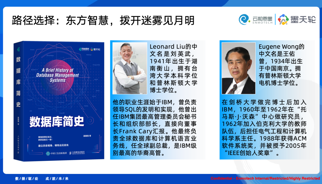 吉姆·格雷(Jim Gray)于1969年取得计算机科学博士学位(他是加州大学伯克利分校计算机科学学院的第一个博士)。关于自己的学习历程,格雷说:“我有点急于求成,所以选择语法分析理论方向作为课题,在一年半内完成了我的博士学位。”博士毕业后,格雷继续从事理论研究与系统开发,先在加州伯克利大学做了两年的博士后,然后加入了IBM。格雷最初的研究方向是面向对象操作系统,后来在机缘巧合之下,转向了数据库领域。从操作系统转向数据库领域的研究,源于上司列昂纳德(Leonard Liu)的建议。格雷回忆,有一天他来到我的办公室,坐下来说:“IBM已经有太多的程序语言和操作系统,如果在这两方面工作,你能做到最好的事情就是干掉其中的几个。而我们在网络和数据库方面有很大的挑战,如果你在寻找一个真正需要新想法的领域,数据库或数据通信领域是最佳选择。”列昂纳德是一个好的说服者,格雷说,“我确实没有好的想法来提高当时操作系统的性能。所以,我做了件顺其自然的事情,开始研究数据库系统。”一念即起,数据库领域迎来了一位石破天惊的天才人物。此后,在IBM期间,格雷参与和主持过IMS、System R、SQL/DS、DB2等项目的开发,其中除System R仅作为研究原型,没有成为产品外,其他几个都成为IBM在数据库市场上有影响力的产品。斯通布雷克的博士论文是关于“马尔可夫链”的算法研究,在完成论文前,他就觉得这不是一个值得投身的领域。要选择什么方向开始职业生涯?这是他一直在思考的问题。网络上流传着一段他对这一时期回顾和判断的话:“计算机产业背后是下一个美好未来,所以,我们弃旧图新。”(The computer industry is driven by the next best thing,so we tend to throw out the old when the new comes along.)斯通布雷克毕业后来到加利福尼亚大学伯克利分校,担任助理教授。注意,斯通布雷克出生于1943年,吉姆·格雷出生于1944年。在1971年左右,他们两位同时身处加利福尼亚大学伯克利分校,前者毕业来从事教职,后者在做博士后,而后加入IBM。斯通布雷克在大学里面临两个重要事项:第一,选择一个值得投身的新领域;第二,尽快发表论文以获得终身教职。这一切和中国当下的大学教职情形非常相似。每个人身边都可能有一位“点火者”,他触发了一次伟大的变革。一切都是偶然,1971年,伯克利的教授王佑曾(Eugene Wong)建议斯通布雷克阅读一下科德的论文,就这样他们开始了数据库领域的论文研究,并深深被其吸引。斯通布雷克表示,一切都是机缘巧合,而非主动绸缪计划。而数据库领域因为这个偶然再次迎来了一位大师级人物。灵感闪现、路径选择,往往都是可遇不可求的机缘。就像那个砸到牛顿的苹果,Wong推荐给斯通布雷克的论文。关于斯通布雷克,还有一个成功的示范,那就是:一位CTO可以不懂编码吗?戴维•德维特说:"回想起来,我们仍然很难理解,一个毕业论文探讨随机马尔可夫链数学、没有任何构建软件工件经验、编程能力有限(实际上我认为是没有)的研究生,是如何最终帮助启动了整个计算机科学研究的新领域,以及一个年收入 500 亿美元的产业的。"在吉姆·格雷和斯通布雷克的职业起点上,两位高人曾经对他们做出点拨,他们分别是: Leonard Liu 和 Eugene Wong 。从名字你就可以看出,这是两位华人领袖,他们以自己的先见,指引两位天才进入数据库领域,并且成就了杰出的事业。Leonard Liu的中文名是刘英武,1941年出生于湖南衡山,拥有台湾大学本科学位和普林斯顿大学博士学位:他的职业生涯始于IBM,曾负责领导SQL的发明和实现、以及 CICS、SNA 和 AIX 等软件的研发管理;