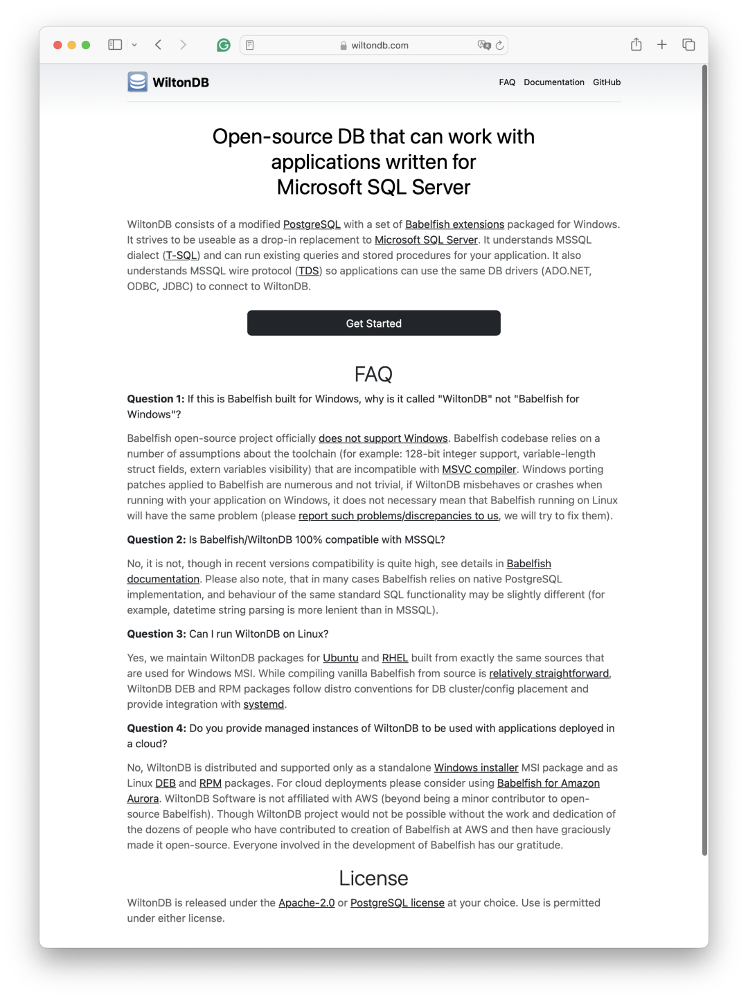 在不同的平台上编译打包这样的内核与扩展并不是轻松容易的一件事,因此 WiltonDB —— 一个 Babelfish 的发行版就做了这件事,将 BabelfishPG 编译打包为 EL 7/8/9 与 Ubuntu 系统,甚至 Windows 下可用的 RPM DEB MSI 包。