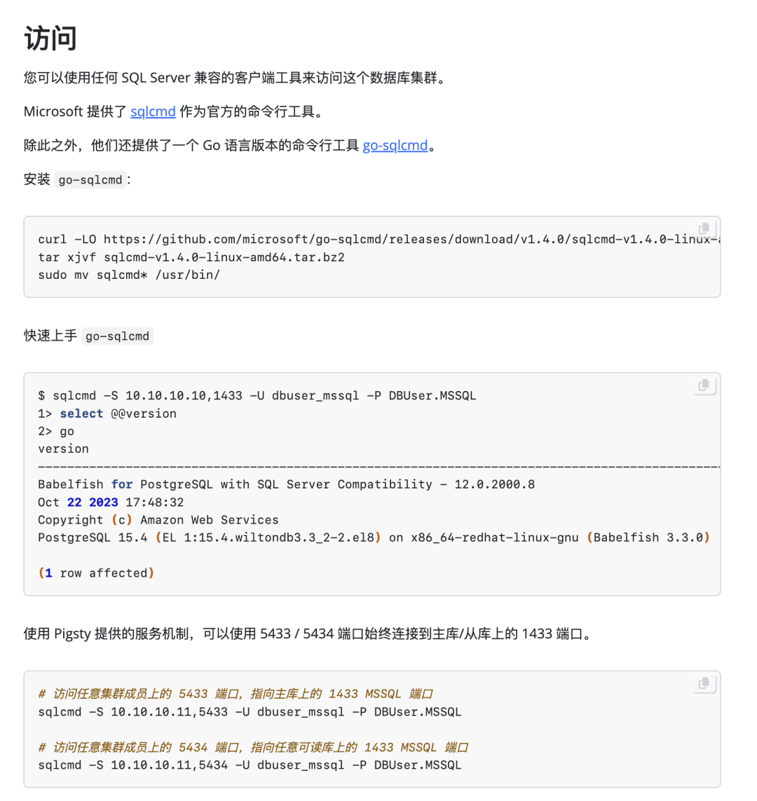 在使用实践上,你完全可以把 Babelfish 集群当作一套普通的 PostgreSQL 集群来使用与管理。唯一的区别就是客户端在使用 5432 PGSQL 协议的基础上,还可以选择是否要使用 1433 端口上的 TSQL 协议支持。