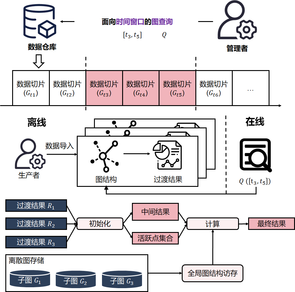 很多图数据由不断生成的数据构成,规模庞大且持续增加中,例如支付宝每天会产生数亿笔交易。很多图查询常常针对一个给定的时间窗口展开,而针对临时窗口内的图分析过程非常耗时。幸运的是,我们发现大多数查询具有一致的模式,并且算法具有单调性。因此,可以在生成切片时计算出过渡结果,以便重复使用。