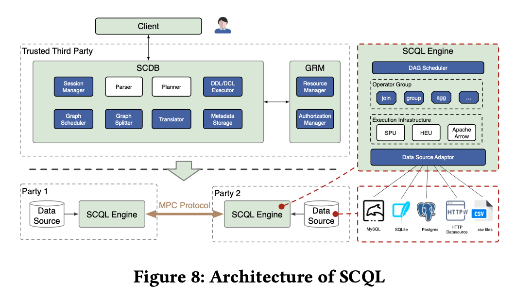 安全多方计算为协作数据分析提供了有效的解决方案,可以在确保数据安全的同时利用数据价值。然而,MPC的性能瓶颈给联合协作数据分析框架设计带来了巨大挑战。在本文中,我们建立了SCQL,用以支持对多方数据通用的SQL查询,同时优化底层MPC协议和设计数据库关系运算以满足规模化的需求,为用户提供一个安全、易用和高效的联合数据分析系统。