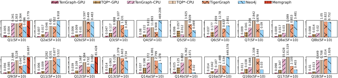 TenGraph创新地基于张量技术,提出了一种高效的内存图查询处理方法。通过设计简洁的张量存储格式,TenGraph能够精准表达图拓扑结构,并通过批量顶点的张量计算,自动实现跨平台,同时支持CPU或GPU处理,并大幅提升查询效率。相比传统的基于CPU的图数据库系统,TenGraph-GPU的处理速度提升了50至100倍,且显著超越了其他基于CPU和GPU的系统。