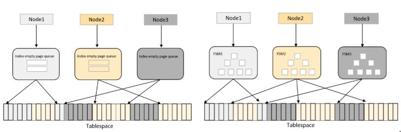 GaussDB云原生数据库在节点亲和性算法设计方面,除了分布式缓冲池的页面属主和读授权机制外,Undo段和FSM算法也充分考虑了节点亲和性设计,将节点间的网络交互降至最低,确保极致性能。在Undo segment的节点亲和性设计上,从undo tablespace分配空间,多节点共享undo tablespace,而每个计算节点使用分布式锁机制亲和性分配Undo segment,每个Undo segment同一时刻只能被一个计算节点绑定。在FSM空闲空间管理节点亲和性算法上,针对Heap FSM采用自动分区机制优化表数据插入分配页面算法,减少节点间冲突;针对索引空页面管理,采用自动分区机制优化索引查找空页面算法,减少节点间冲突。