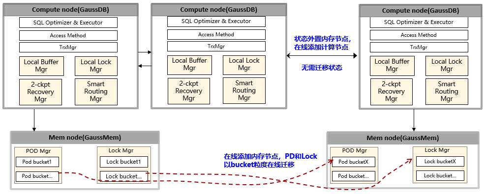 在弹性扩展方面,GaussDB采用计算-内存-存储三层池化解耦设计,支持分层独立弹性伸缩,对应用透明。计算层将全局锁和页面属主目录(POD,Page Owner Directory)等状态下沉至共享内存层,本地仅保留数据页面,计算层增删节点无需状态信息迁移,实现秒级弹性伸缩;共享内存层采用POD方式管理缓冲池页面属主关系,POD基于一致性Hash均匀分布在共享内存层,增删节点仅迁移少量Bucket,内存层秒级弹性,应用无感知。